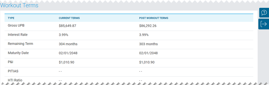 Current Terms | Displays the current mortgage terms prior to the workout. | |||||||||||||||||||